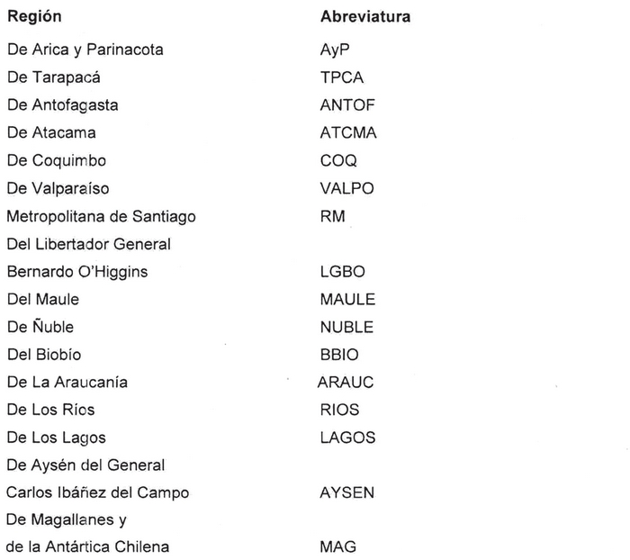 Artículo 1°: En cumplimiento de lo dispuesto en el artículo 9º inciso tercero de la ley Nº 21.074, se establecen las siguientes abreviaturas que se podrán utilizar para efecto de simplificar la identificación de las regiones del país.