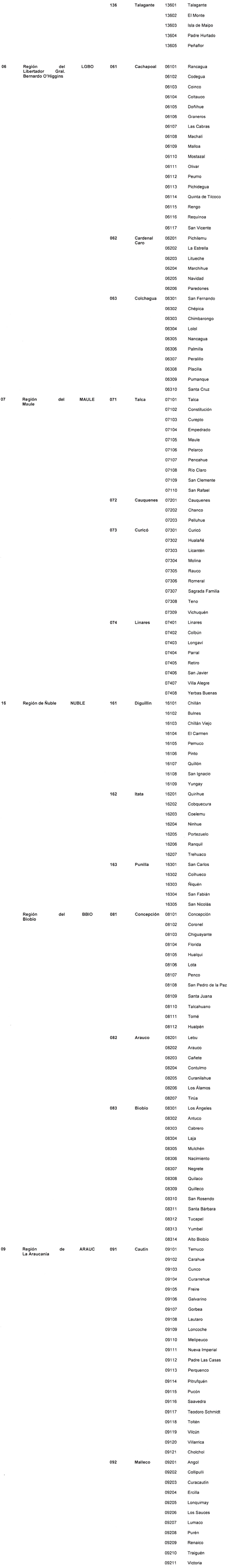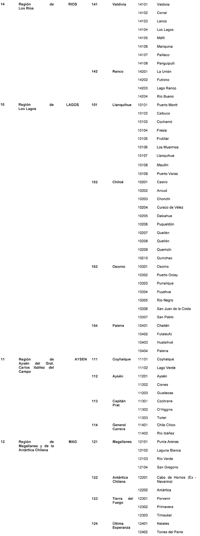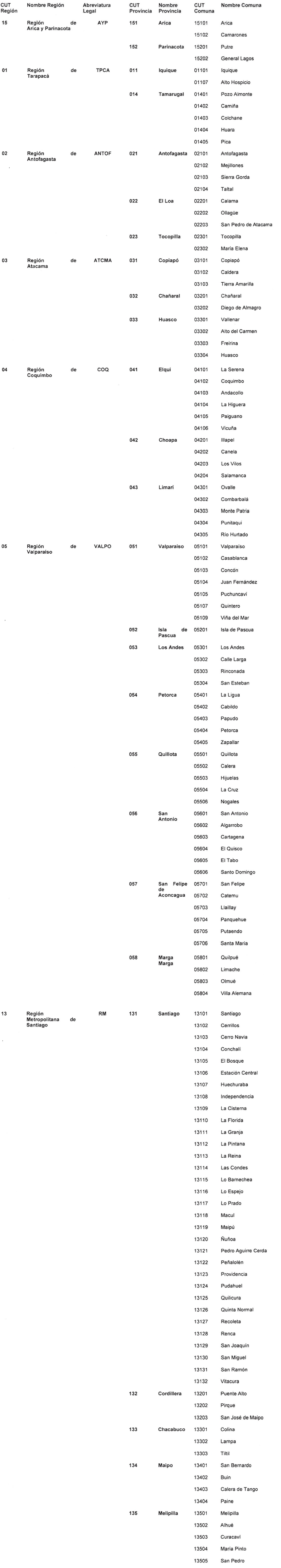 Artículo 3º: Las abreviaturas para la identificación de las regiones del país y la codificación única para las regiones, provincias y comunas del país sistematizada en el presente decreto, deberá ser utilizada por los órganos que integran la Administración del Estado, incluidas las empresas públicas creadas por ley, en la información que administren respecto a las unidades territoriales antes mencionadas, sin que puedan utilizarse otras nominaciones distintas a las que se establecen.