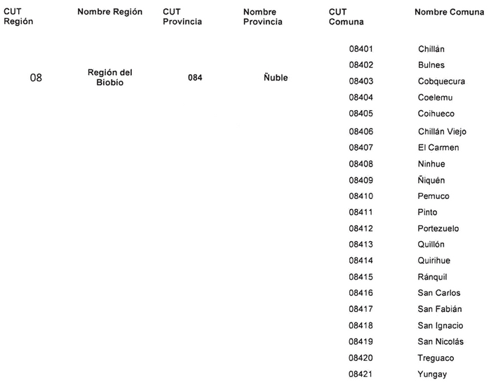 En el tiempo que medie entre la publicación del presente decreto y el 5 de septiembre de 2018, las comunas y provincias que componen dicha región mantendrán los códigos únicos territoriales que se indican a continuación: