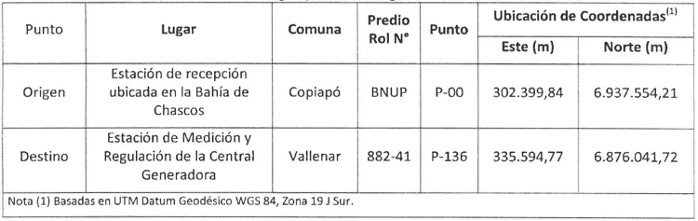 A continuación, se indican los puntos de origen y destino del referido gasoducto, de acuerdo al Plano GA-PLA-GEN-01 "Plano General Trazado de Gasoducto", en Revisión B.