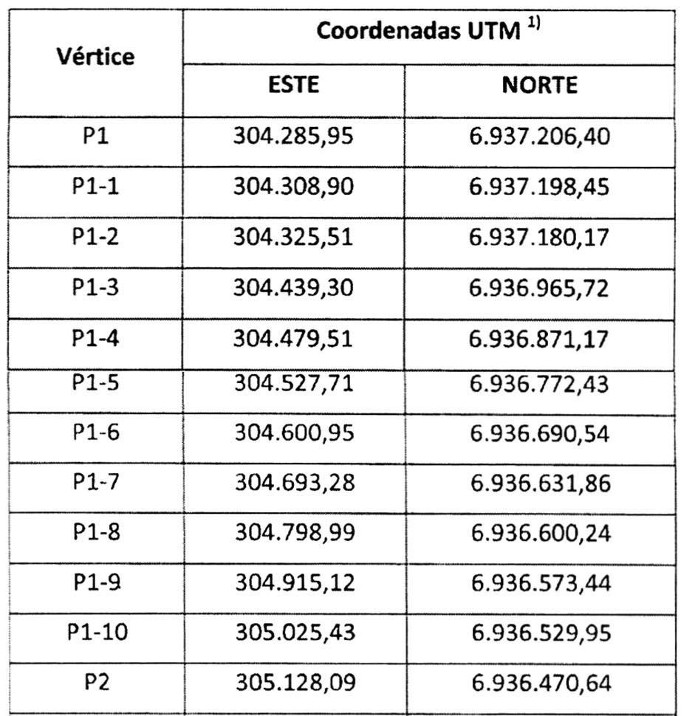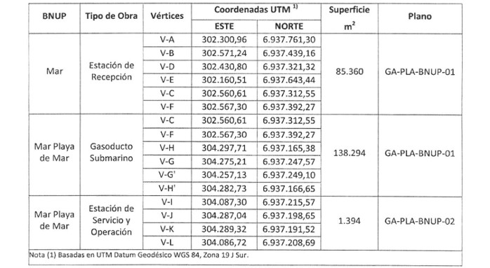 Tabla 2. Cuadro de coordenadas de vértices del trazado del gasoducto submarino, sectores de mar y playa de mar.