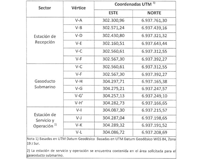 En la tabla 4 se muestran las coordenadas de los vértices que limitan las áreas de la estación de recepción, gasoducto submarino y estación de servicio y operación: