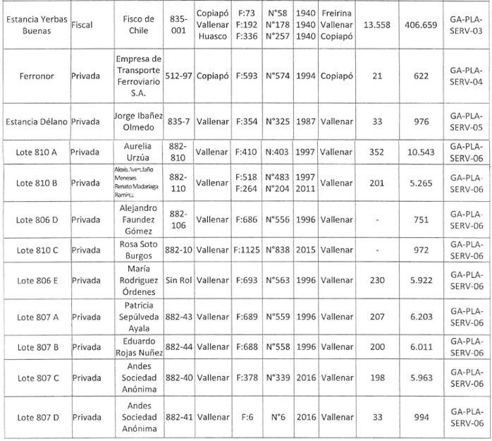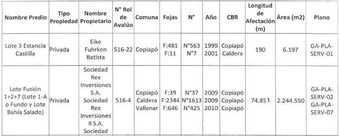 . Cuarto. Las propiedades que se afectarán por las servidumbres forzosas se detallan a continuación en la Tabla 6.