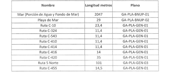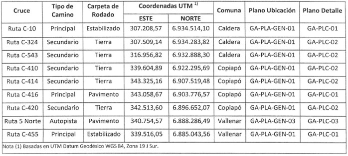 . Quinto. Los bienes nacionales de uso público que serán objeto de ocupación o cruce producto de la construcción y trazado del gasoducto se detallan a continuación en las Tablas Nos 8, 9 y 10. El detalle típico de los cruces de caminos y rutas, se muestra en los planos GA-PLC-01 "Plano Cruce Camino Principal"; GA-PLC-02 "Plano Cruce Camino Secundario" y GA-PLC-03 "Plano Cruce Ruta 5 Norte", todos en Revisión B.