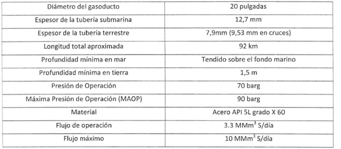 El gasoducto tendrá una capacidad máxima operacional de transporte de 10 MMm 3 S/día (diez millones de metros cúbicos estándar por día) y se construirá utilizando un ducto de acero de calidad API 5L grado X60 y de 508 mm (20") de diámetro nominal, lo cual permitirá operar a una máxima presión de operación admisible (MAOP) de 9 MPa (90 bar).
