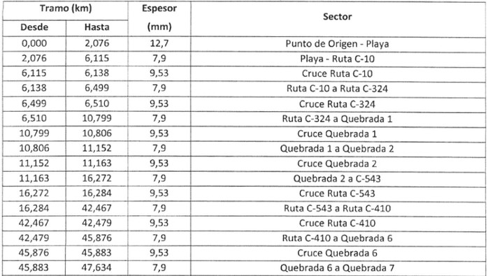 . Séptimo. Los parámetros de diseño y espesores de tubería para los tramos submarino y terrestre, se presentan a continuación en las Tablas Nos 13 y 14.