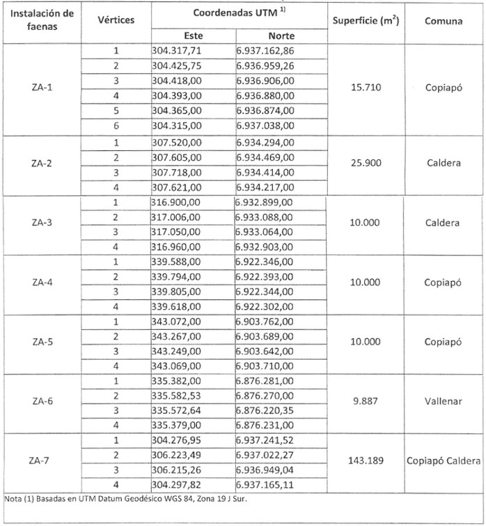 . Los sitios de acopio y servicio transitorio, que servirán de instalación de faena, acopio de cañerías y materiales, así como las oficinas para el constructor e inspector de la obra se detallan en los planos GA-PLA-SERV-01 "Plano de Servidumbre Lote 3 Estancia Castilla"; GA-PLA-SERV-02 "Plano de Servidumbre Lote Fusión 1+2+7"; GA-PLA-SERV-03 "Plano de Servidumbre Estancia Yerbas Buenas"; GA-PLA-SERV-04 "Plano de Servidumbre Ferronor"; GA-PLA-SERV-05 "Plano de Servidumbre Estancia Délano"; GA-PLA-SERV-06 "Plano de Servidumbre Loteos" y GA-PLA-SERV-07 "Plano de Detalle de Servidumbre Lote Fusión 1+2+7"; todos en Revisión B. Su ubicación se indica en la Tabla 5.