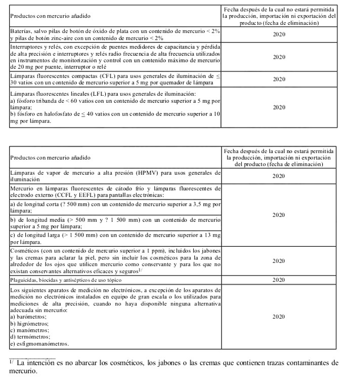 1. Cada Parte prohibirá, adoptando las medidas pertinentes, la fabricación, la importación y la exportación de los productos con mercurio añadido incluidos en la parte I del anexo A después de la fecha de eliminación especificada para esos productos, salvo cuando se haya especificado una exclusión en el anexo A o cuando la Parte se haya inscrito para una exención conforme al artículo 6.