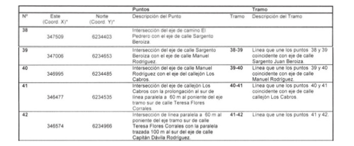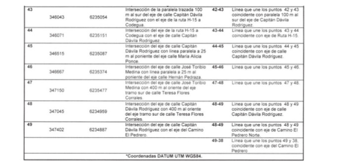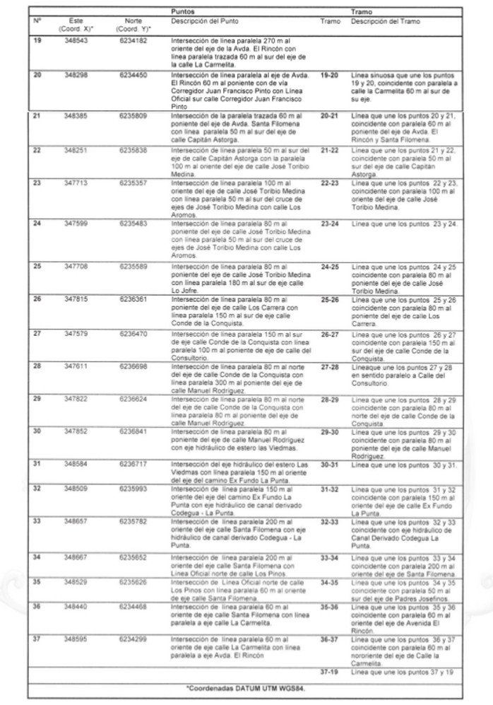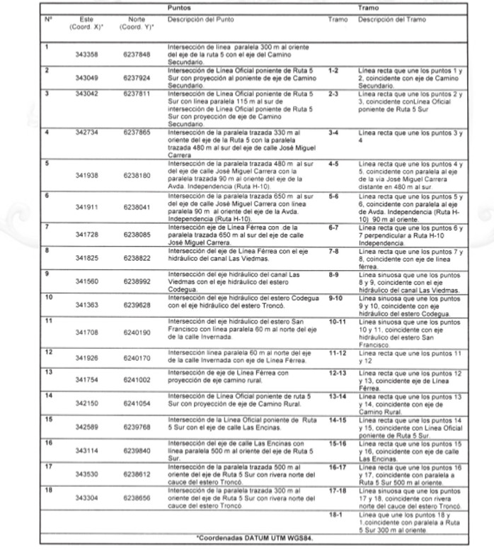 El Límite Urbano de las áreas normadas por el presente Plan, se define por los puntos y tramos que conforman la poligonal graficada en planos PRCSFM-06110 localidad de San Francisco de Mostazal, PRCPLR-06110 localidad de La Punta-El Rincón y PRCLM-06110 localidad de Los Marcos, los que se describen y detallan a continuación: