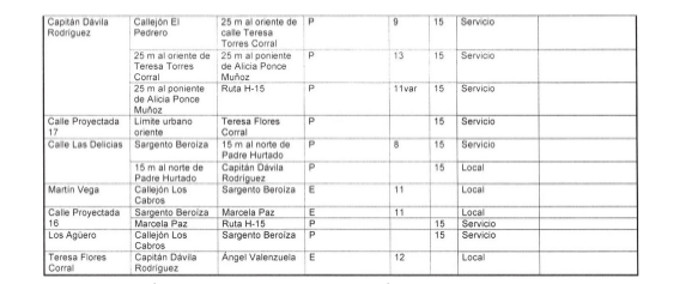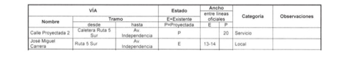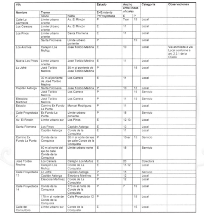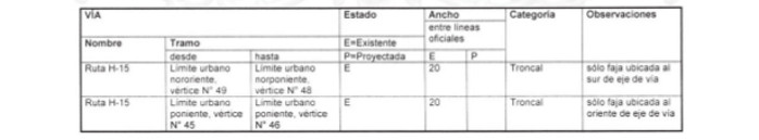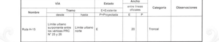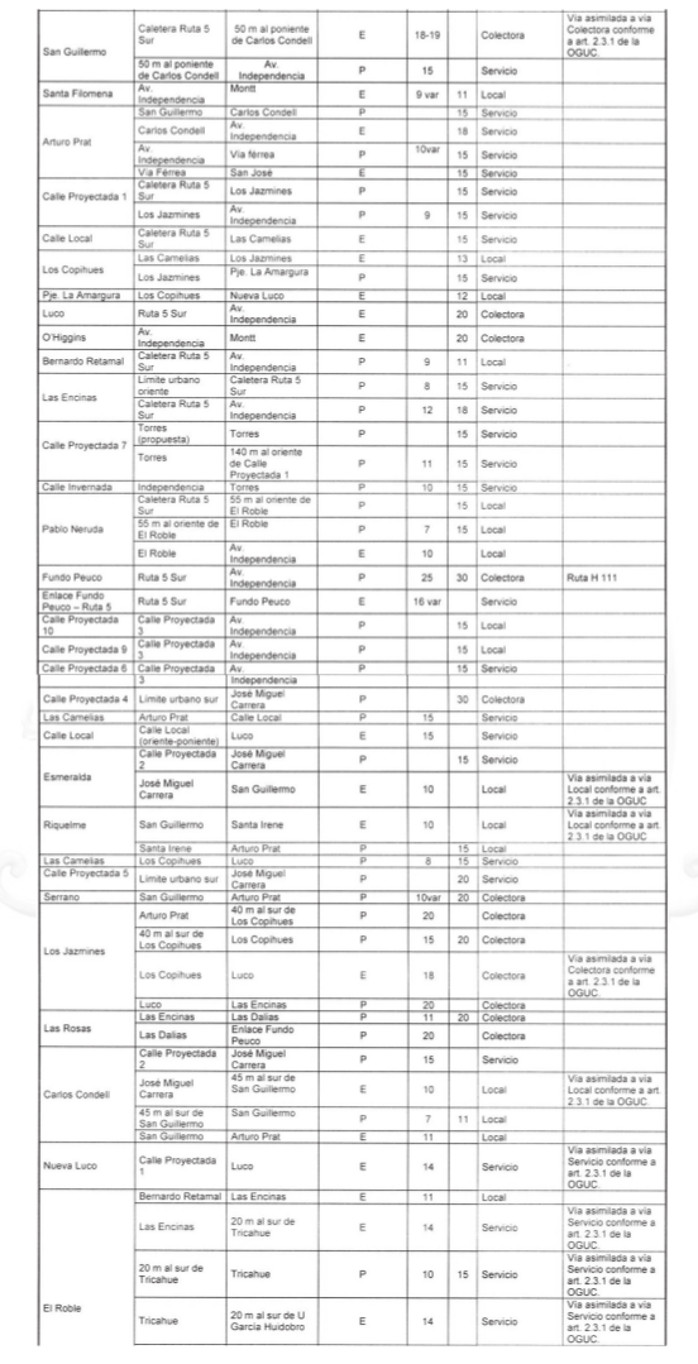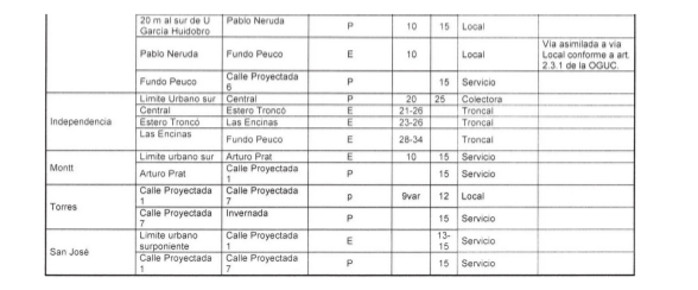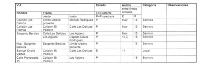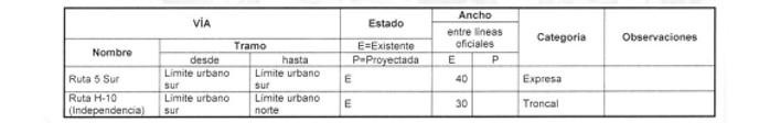 La Vialidad estructurante de nivel comunal, de las áreas urbanas reguladas por el presente Plan, están constituidas por el conjunto de vías colectoras, de servicio y locales que se grafican en los planos y cuya identificación, ancho entre líneas oficiales y demás características son las siguientes: