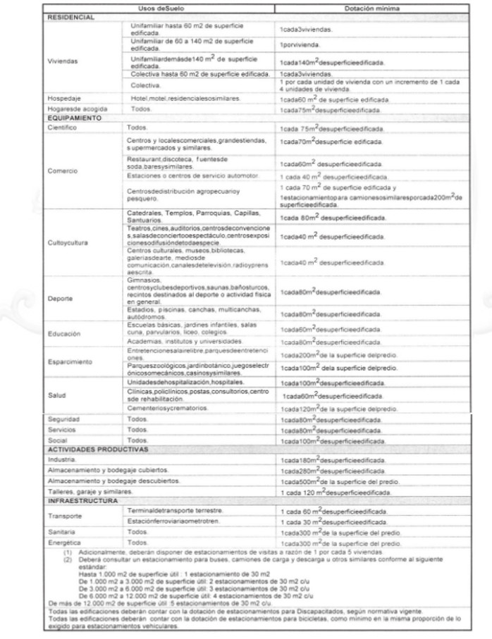 Según el destino de las edificaciones se deberá contemplar la dotación mínima de estacionamientos que se señalan a continuación: