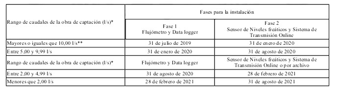 2.2 Los plazos para la instalación de los dispositivos correspondientes a ambos sistemas (a, b y c precedentes) serán diferenciados por rango de los caudales de la obra de captación y en 2 fases como se indica en la siguiente Tabla: