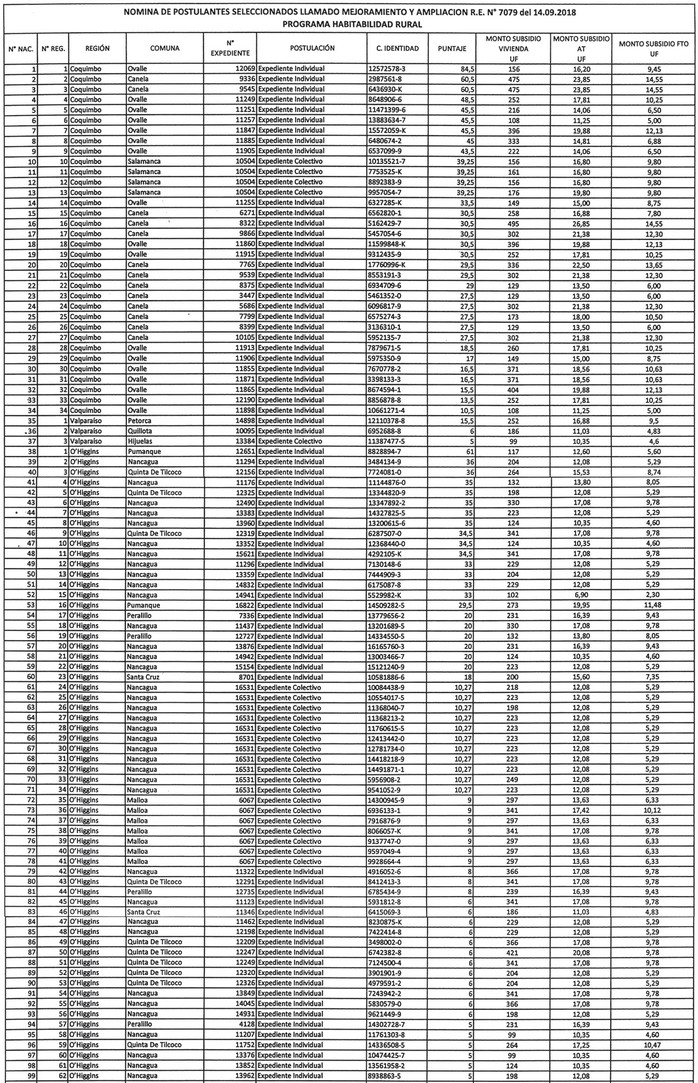 .2. Apruébanse las nóminas de seleccionados para el otorgamiento de subsidios habitacionales correspondientes al cierre de postulación del Llamado en Condiciones Especiales de 2018, del Programa de Habitabilidad Rural en su Título II, Modalidad Mejoramiento y Ampliación de Viviendas Existentes, regulado mediante la resolución exenta Nº 7.079 (V. y U), de 2018 y su modificación, las que se adjuntan a la presente resolución. Además, fíjase el número de postulantes seleccionados por Región, según se indica en la siguiente tabla:
