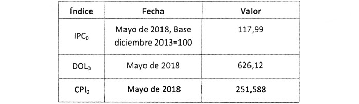 Los valores base para los índices antes definidos corresponden a los que a continuación se indican: