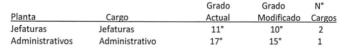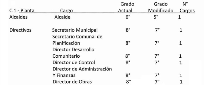 . C.- Modifíquense los grados de los cargos que se indican, de acuerdo con lo señalado en el acápite IV, número 10 del oficio N° 17.773 de la CGR, de fecha de 13 de julio de 2018, en concordancia con lo señalado en el artículo 48º de la Ley 18.695, Orgánica Constitucional de Municipalidades: