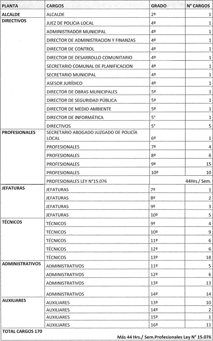 Artículo 5°: Establézcase la planta de personal de la Municipalidad de Colina, quedando de la siguiente manera: