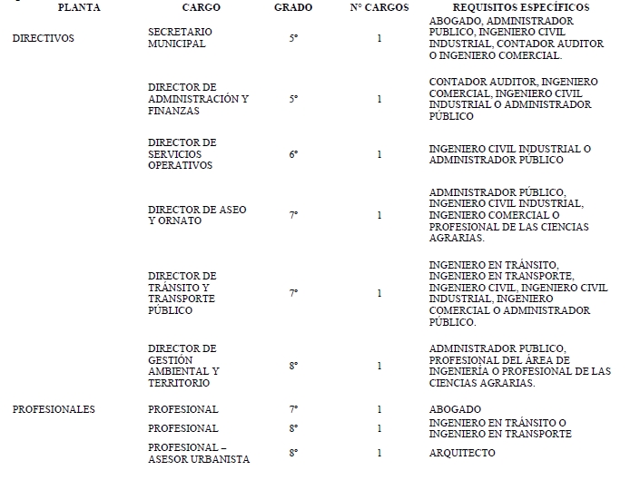 f) Que, para lo anterior, deberá estructurarse una planta que contenga nuevos cargos que permitan satisfacer los requerimientos de la comunidad y, que den cumplimiento a las facultades, funciones y atribuciones que la normativa legal vigente establece.