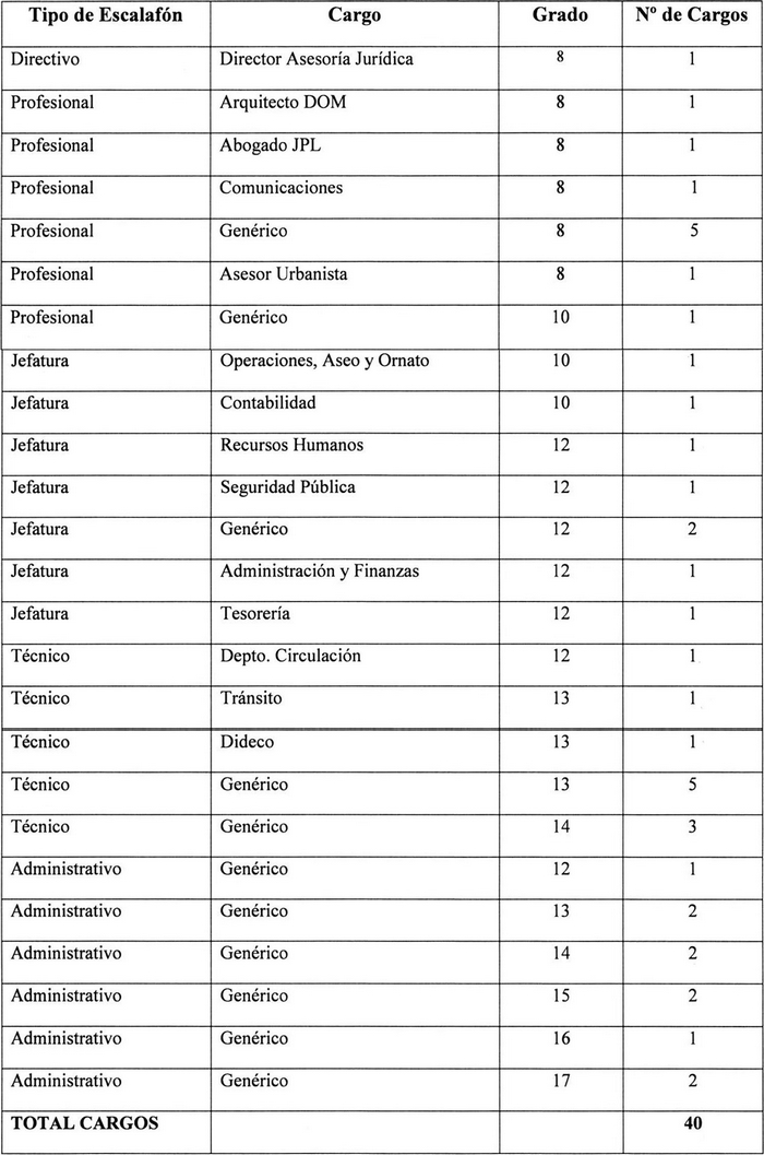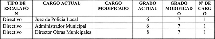 Artículo 2: En atención a lo previsto en el artículo 48 de la Ley Nº 18.695, Orgánica Constitucional de Municipalidades que establece que: "En el sistema legal de remuneración de las municipalidades se procurará aplicar el principio de que a funciones análogas, que importen responsabilidades semejantes y se ejerzan en condiciones similares, se les asignen iguales retribuciones y demás beneficios económicos", y dando cumplimiento al Instructivo Nº 17.773 de 13 de julio de 2018, de Contraloría General de la República que impartió instrucciones en relación con el ejercicio de la facultad para fijar o modificar las plantas de personal de las municipalidades, la Municipalidad de Diego de Almagro ha estimado pertinente efectuar las adecuaciones y modificaciones de grados remuneratorios de los cargos que se indican en este artículo.