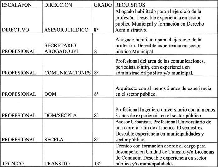Artículo 5: Sin perjuicio de lo que al efecto se establezcan en las Bases de los respectivos llamados a Concurso Público, cuando fuere procedente, preferentemente los cargos que se indican a continuación deberán cumplir los requisitos específicos que para cada caso se indican: