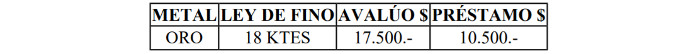 1.- Fíjase nuevo avalúo por el gramo de metales nobles Ley de Fino Oro 18 Ktes., utilizando en el cálculo de los préstamos con garantía prendaria del rubro alhajas conforme a la siguiente tabla y las siguientes condiciones: