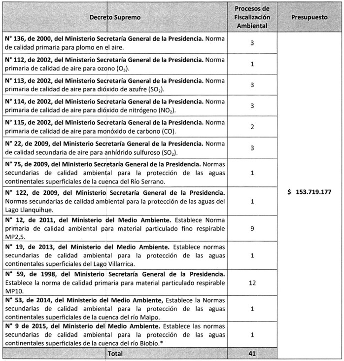 * Se podrán ejecutar los procesos de fiscalización ambiental, en la medida que la Superintendencia apruebe, a solicitud del Ministerio del Medio Ambiente, el Programa de Medición y Control de la Calidad Ambiental respectivo, y que los organismos encargados de levantar la información cuenten con presupuestos para efectuar campañas de monitoreo durante el año 2019.