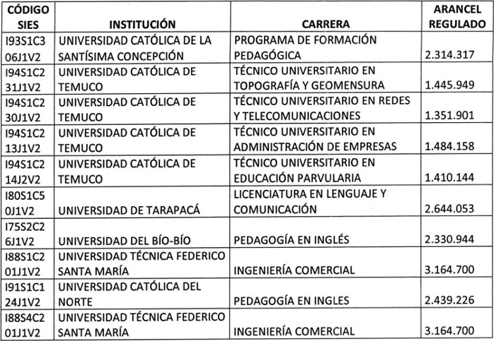 Artículo único: Fíjase el arancel regulado para los programas impartidos por las instituciones de educación superior adscritas a gratuidad, así como de aquellas que recibirán recursos públicos en virtud del artículo 114 de la ley Nº21.091, de conformidad al contenido de la siguiente tabla: