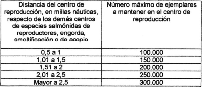 "f) En el caso de centros de cultivo emplazados en mar, destinados exclusivamente a la reproducción de especies pertenecientes al grupo de especies Salmónidas, de conformidad con el artículo 21 bis del DS Nº 290, de 1993, del Ministerio de Economía, Fomento y Reconstrucción: 25% del número de ejemplares destinados anualmente a reproducción.".