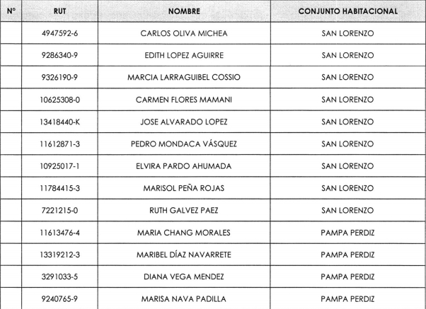 2. Sanciónase inclusión en nómina para el otorgamiento de subsidios habitacionales del Programa Fondo Solidario de Elección de Vivienda a damnificados de los Conjuntos Habitacionales Cerro Tarapacá Etapa I, Pampa Perdiz y San Lorenzo, ambos de la comuna de Alto Hospicio, conforme a la delegación de facultades establecidas en el resuelvo 7° de resoluciones exentas N° 5.928 y N° 5.929 (V. y U.), ambas de fecha 7 de gosto de 2015, a los beneficiarios que se individualizan a continuación: