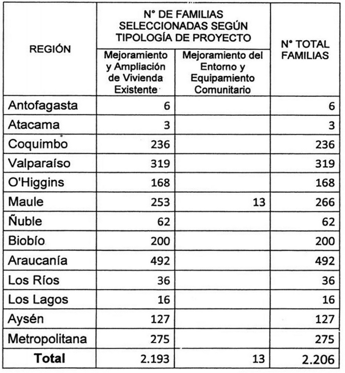 2) Apruébanse las nóminas de seleccionados para el otorgamiento de subsidios habitacionales correspondientes al cierre de postulación del Llamado en Condiciones Especiales de 2018, del Programa de Habitabilidad Rural en su Título II, en las modalidades Mejoramiento y Ampliación de Viviendas Existentes y Mejoramiento del Entorno y Equipamiento Comunitario, regulado mediante la resolución exenta N° 9.521 (V. y U.), de 2018, y sus modificaciones, las que se adjuntan a la presente resolución. Además, fíjase el número de postulantes seleccionados por Región y tipología de proyecto, según se indica en la siguiente tabla: