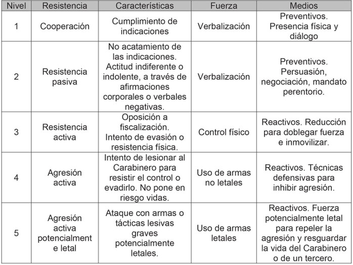 Una representación esquemática de la correspondencia entre niveles de resistencia o agresión y nivel de fuerza policial para tener esta oposición al control policial, se encuentra en el "Modelo para el uso de la Fuerza Policial de Carabineros" del Cuadro 1.