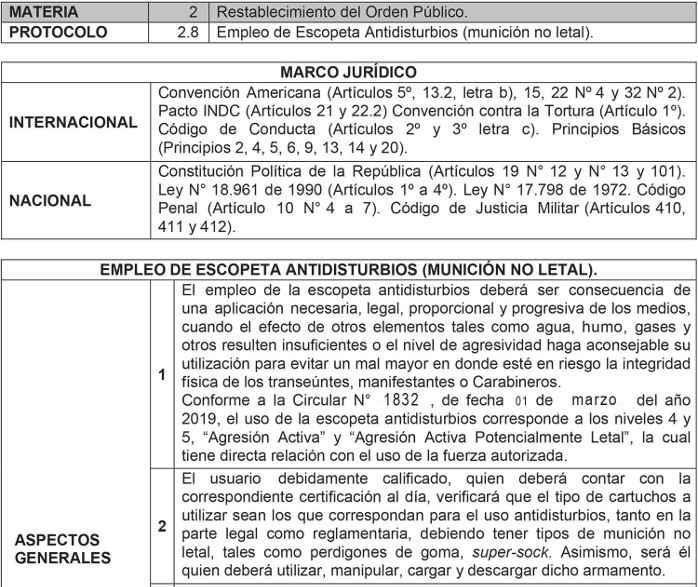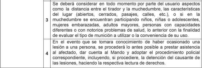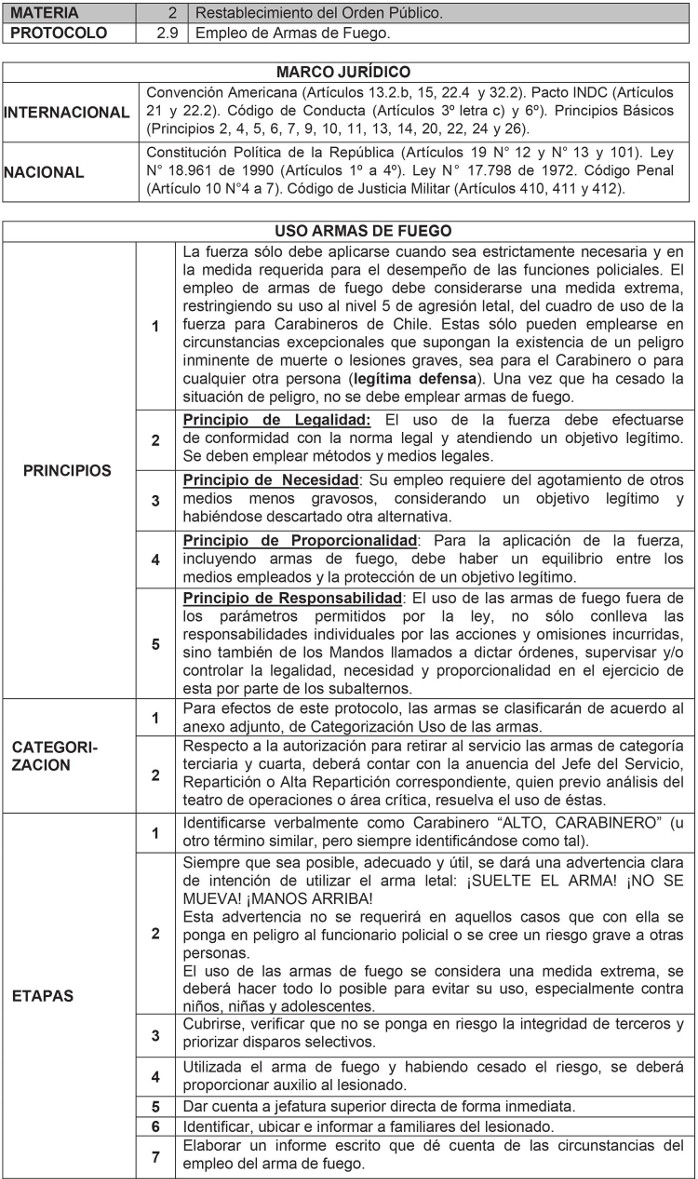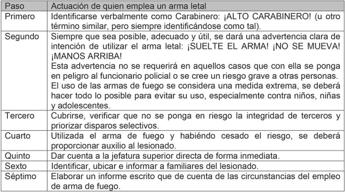 El empleo de armas letales es una medida extrema, aceptable sólo en circunstancias excepcionales que supongan un peligro inminente de muerte o lesiones graves para el Carabinero o para cualquier otra persona.