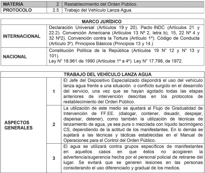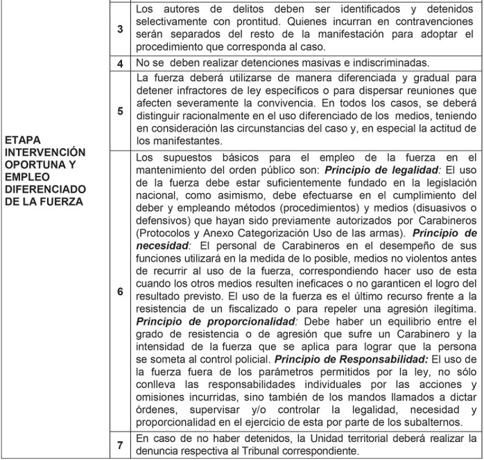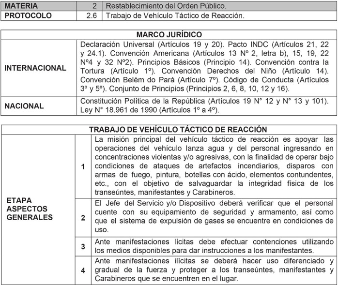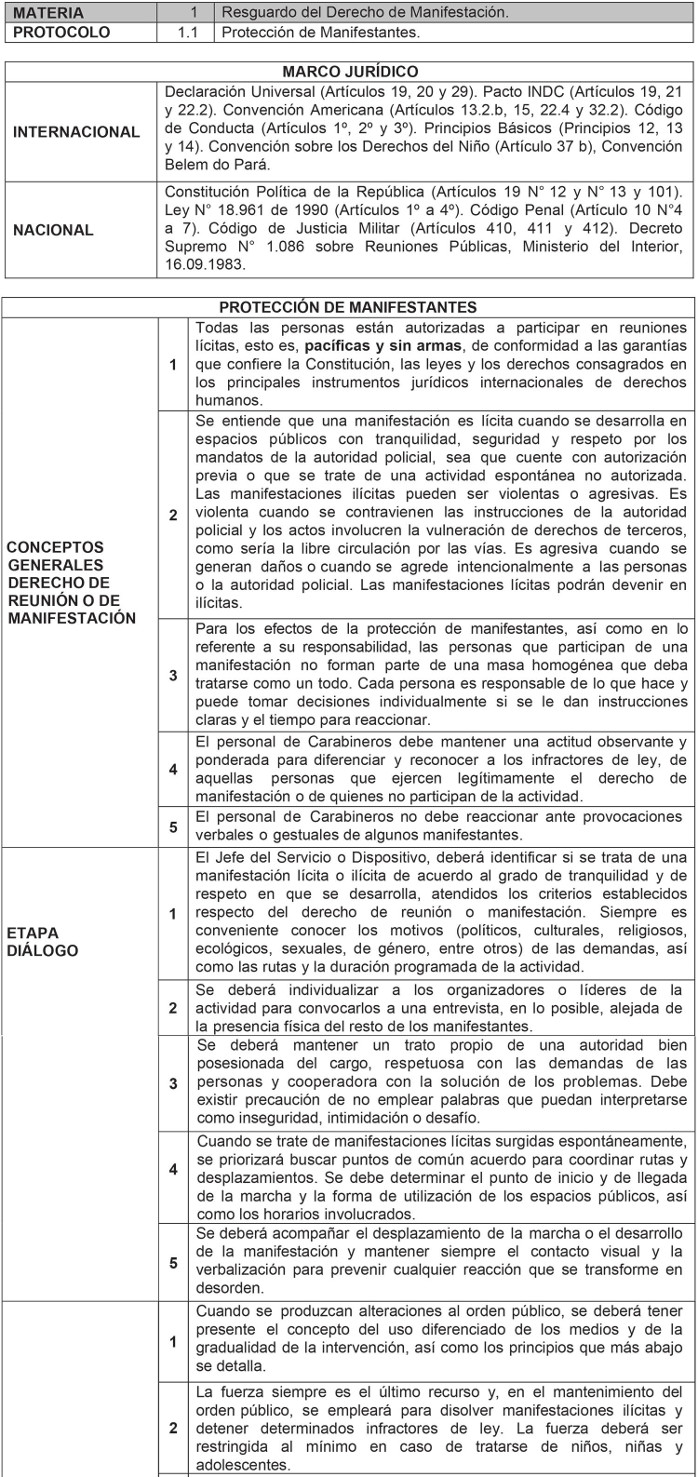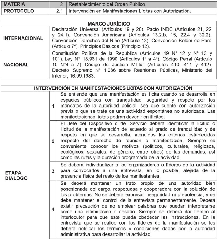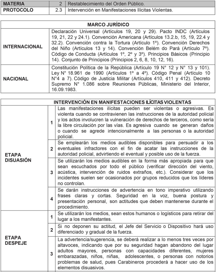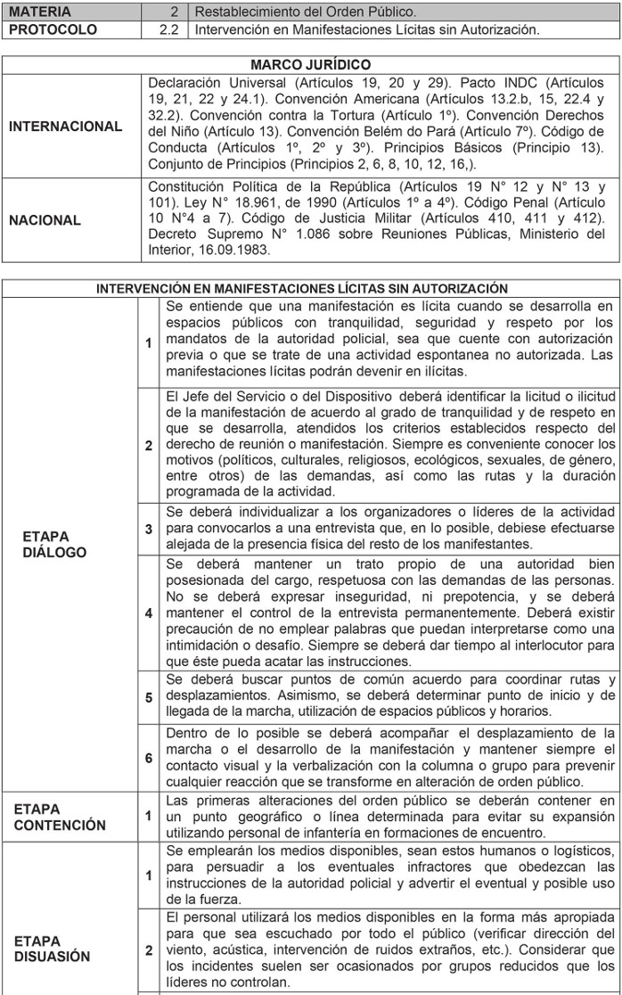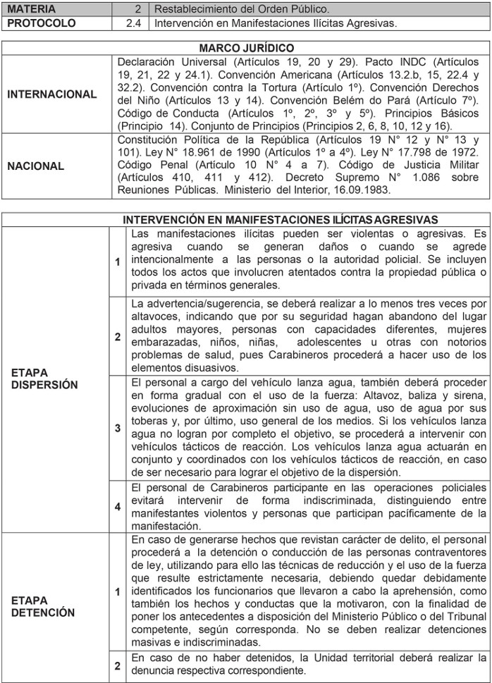 2.- Dispónese que todas las actividades de Carabineros a nivel nacional, relativas al resguardo del derecho de reunión y al mantenimiento del orden público, se enmarquen dentro de los lineamientos, criterios, principios y etapas que establecen los protocolos respectivos.