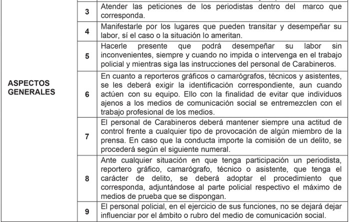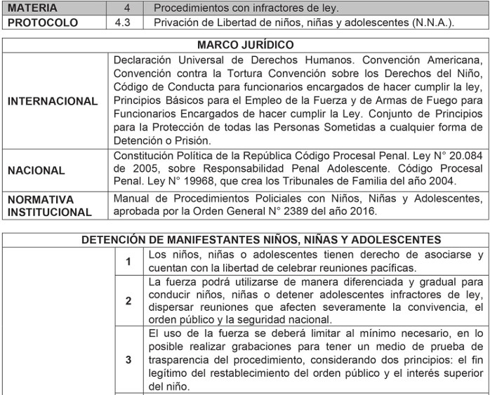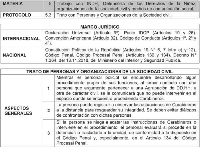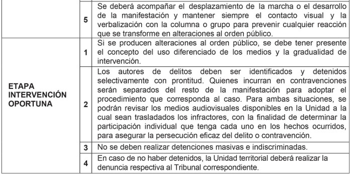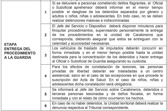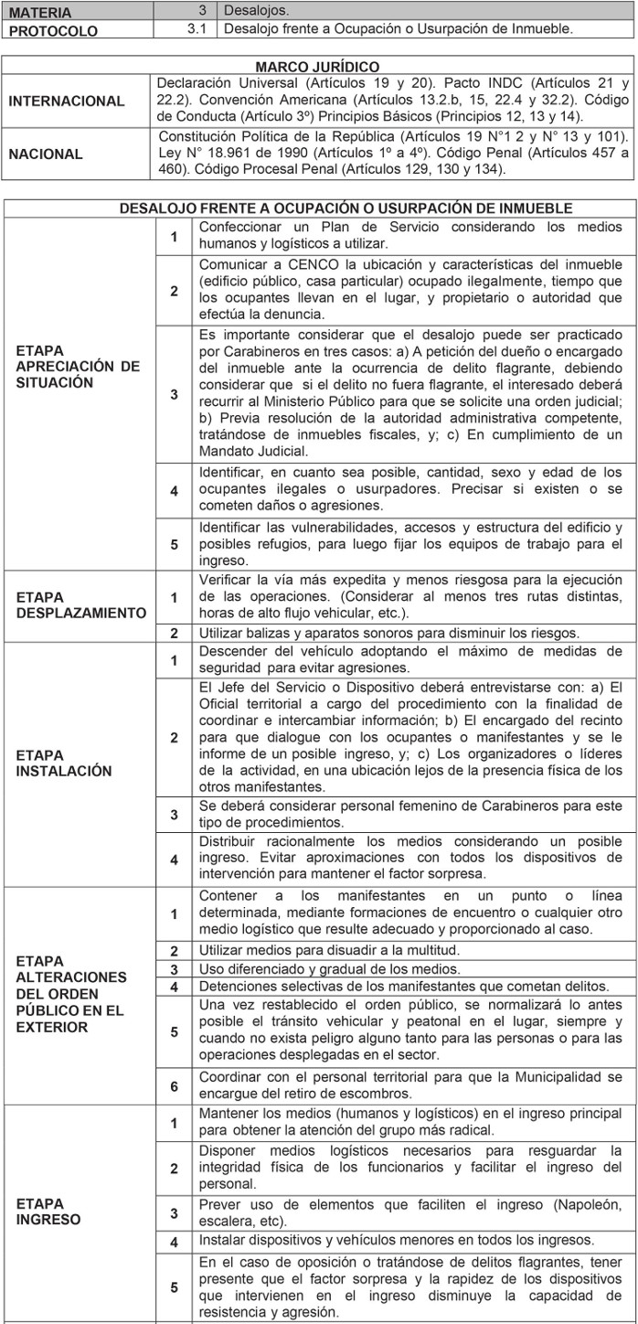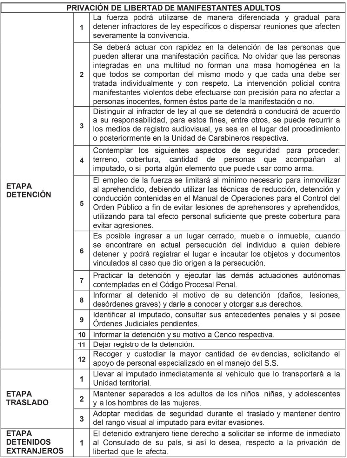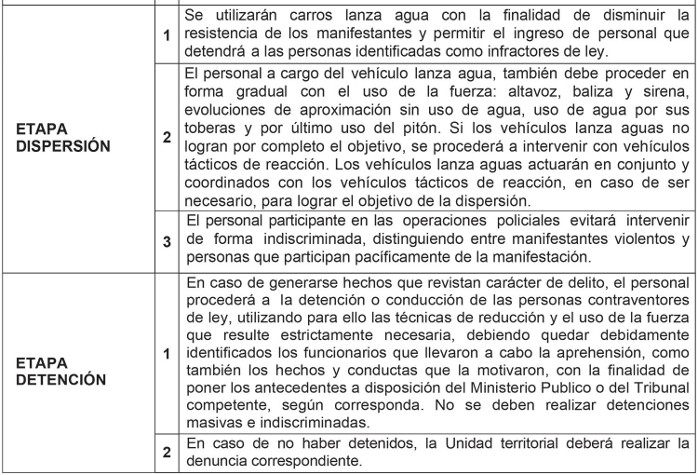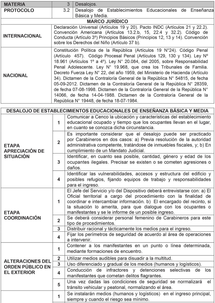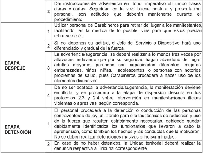 2.- Dispónese que todas las actividades de Carabineros a nivel nacional, relativas al resguardo del derecho de reunión y al mantenimiento del orden público, se enmarquen dentro de los lineamientos, criterios, principios y etapas que establecen los protocolos respectivos.