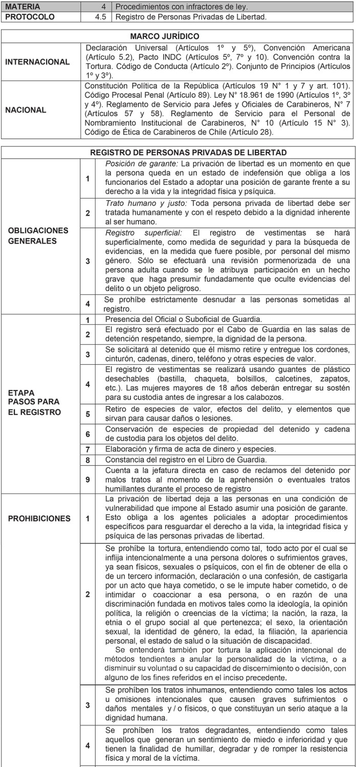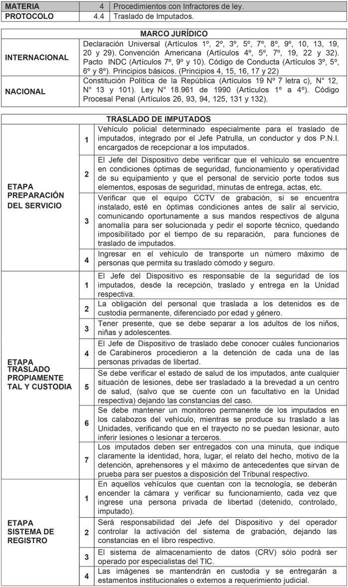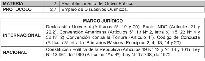 El cumplimiento de los principios de legalidad, necesidad, proporcionalidad y responsabilidad garantizan que el uso de esta fuerza se haga cumpliendo los estándares internacionales, garantizando el respeto de los derechos humanos y el profesionalismo policial. Estas pautas no sólo dan garantías a la comunidad del alto estándar de servicio que quiere alcanzar permanentemente Carabineros de Chile sino, al mismo tiempo, legitiman jurídica y éticamente las intervenciones policiales en que se hace uso de la fuerza.