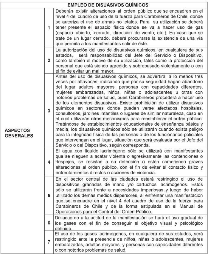 7. DISUASIVO QUÍMICO: El disuasivo químico utilizado por Carabineros corresponde al componente denominado Ortoclorobenzolmalononitrilo o Clorobenzalmaloninitrilo o Clorobenzilideno malononitrilol (nomenclaturas comúnmente utilizadas), en sus tres estados sólido, líquido y gaseoso.