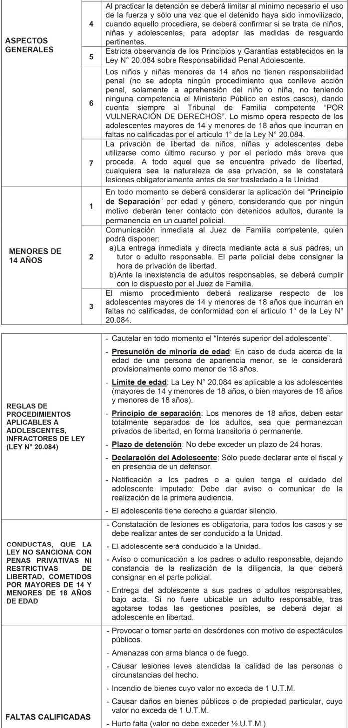 De igual modo, debe tenerse presente que los funcionarios policiales no podrán hacer uso de la fuerza en contra de personas detenidas, salvo cuando sea estrictamente necesario para concretar la detención, para mantener el orden en las Unidades policiales o cuando esté en peligro la integridad física de alguna persona, como asimismo, se encuentra absolutamente prohibido ejercer cualquier acto constitutivo de tortura, tratos inhumanos o degradantes en contra de las personas que se encuentren sometidas en cualquier condición al control o actuar policial.