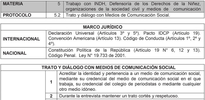 Como funcionarios encargados de hacer cumplir la ley, los miembros de Carabineros de Chile podrán hacer uso de la fuerza de forma gradual y proporcional en aquellos casos que se obre en legítima defensa, esto es, para proteger la integridad de terceras personas o la suya, toda vez que tienen bajo su cargo hacer cumplir la ley, respetar y proteger la dignidad humana, y defender los derechos humanos de todas las personas.