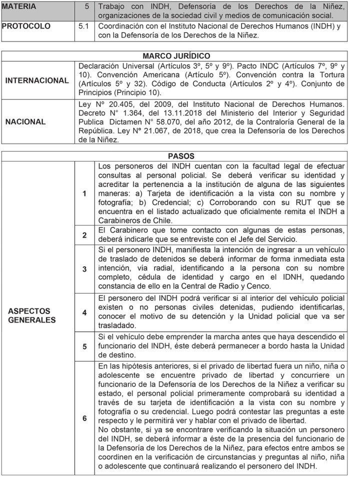 5.1 Coordinación con Instituto Nacional de Derechos Humanos (INDH) y la Defensoría de los Derechos de la Niñez.