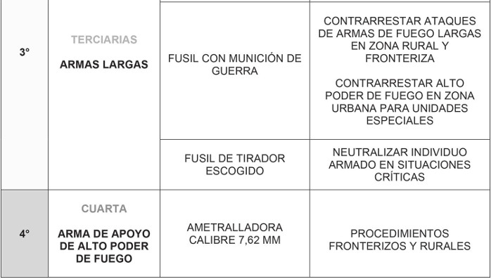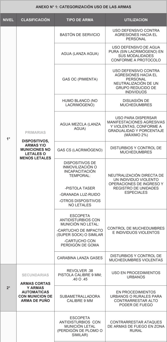 Nivel 5 de fuerza: Uso de armas potencialmente letales. Empleo de medios reactivos y de fuerza potencialmente letal para repeler la agresión y proteger la vida del Carabinero o de un tercero. Se deben considerar en esta etapa los requisitos de legalidad, necesidad, proporcionalidad y responsabilidad.