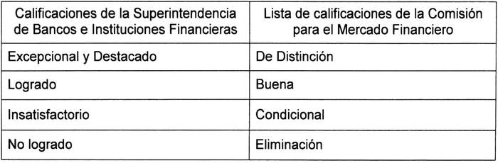 D.O. 06.03.2020 Superintendencia de Bancos e Instituciones Financieras a la Comisión para el Mercado Financiero el reglamento a que se refiere el artículo 49 de este decreto con fuerza de ley, deberá aplicarse la siguiente tabla de homologación de la lista de calificaciones, según corresponda: