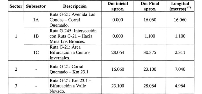 El proyecto considera además la conservación y el mantenimiento de todos los Sectores definidos en la Tabla precedente, durante todo el periodo que dure la Concesión tanto de las obras nuevas a ejecutar por la Sociedad Concesionaria como de las preexistentes que se indican en el artículo 1.8.7 de las Bases de Licitación, de acuerdo a los Estándares Técnicos y Niveles de Servicio exigidos en las Bases de Licitación. Una vez autorizada la Puesta en Servicio Provisoria Parcial de las obras de un Sector, quedarán excluidos del Contrato de Concesión los tramos de la antigua traza vial que queden desconectados del nuevo trazado, los cuales serán entregados a la Municipalidad de Lo Barnechea en virtud del convenio indicado en el Anexo N° 5 de las Bases de Licitación; quedará excluida además el área de montaña de la Dirección de Vialidad a que se refiere el artículo 2.2.2.27 de las Bases de Licitación, la cual será de responsabilidad de la Dirección de Vialidad.