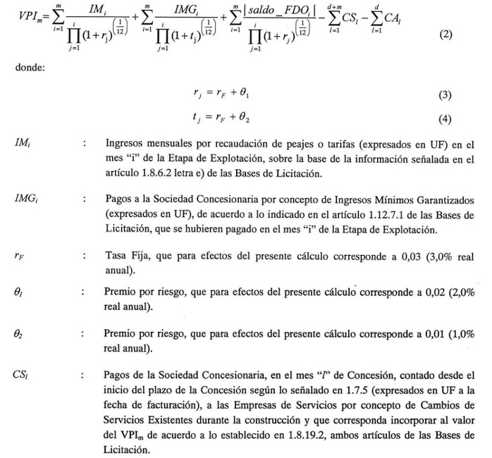 Donde el término VPIm corresponde al Valor Presente de los Ingresos de la Sociedad Concesionaria (expresados en UF), calculado en el mes "m" de Concesión, contado desde la fecha de la autorización de la Puesta en Servicio Provisoria Parcial de las Obras del Sector 1, de acuerdo a lo señalado en el artículo 1.10.1 de las Bases de Licitación (el mes en que se autoriza la Puesta en Servicio Provisoria Parcial de las Obras del Sector 1 es m=1), y actualizado al mes anterior al de dicha autorización de Puesta en Servicio Provisoria Parcial de las Obras, y el término ITC corresponde a los Ingresos Totales de la Concesión ofertados por el Grupo Licitante adjudicatario en su Oferta Económica por un valor de UF 4.849.448 (cuatro millones ochocientos cuarenta y nueve mil cuatrocientos cuarenta y ocho Unidades de Fomento) según se señala en el artículo 3.2.1 de las Bases de Licitación.