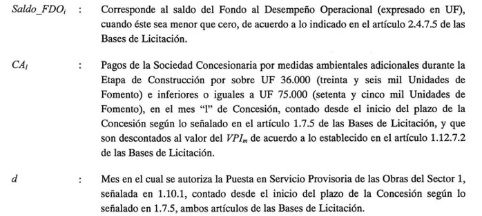- La primera cuota ascendente a UF 108.696 (ciento ocho mil seiscientas noventa y seis Unidades de Fomento), se pagará en el plazo máximo de 210 (doscientos diez) días contados desde que el Inspector Fiscal del proyecto apruebe la Declaración de Avance correspondiente al 30% de las obras del Sector 1;