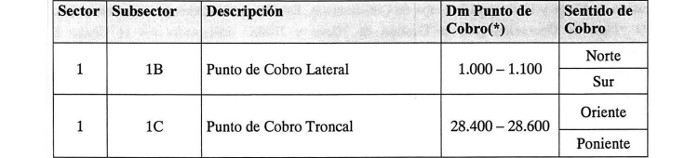 La ubicación de los Puntos de Cobro a lo ancho de la vía, se detalla en la siguiente Tabla: