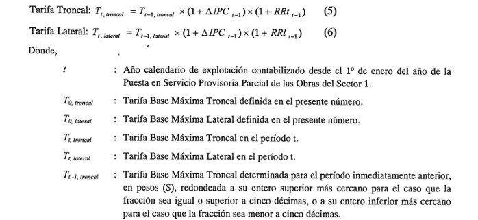El valor de las Tarifas Base Máximas se reajustará a partir del 1° de enero de cada año de explotación o cada vez que se compruebe una inflación acumulada desde la última revisión tarifaria igual o superior al 15%. En este último caso las Tarifas Base Máximas se reajustarán en un valor igual a dicha inflación acumulada. Para el cálculo de las Tarifas Base Máximas reajustadas se usarán las siguientes expresiones: