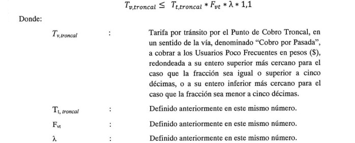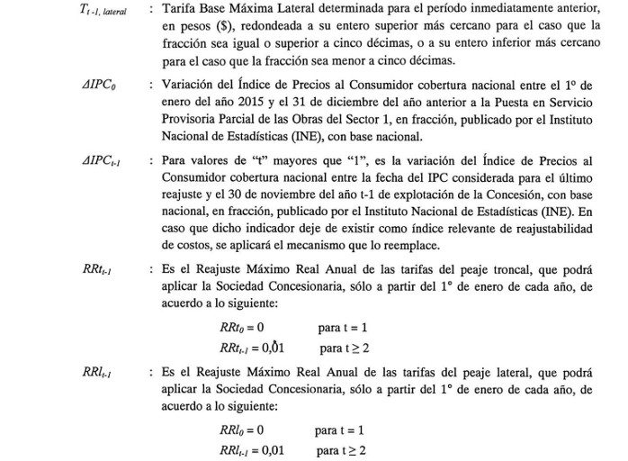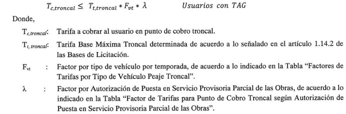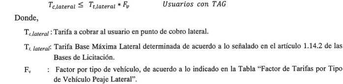 De conformidad con lo establecido en el artículo 1.14.2 de las Bases de Licitación, la Tarifa Base Máxima Troncal (T0,troncal) y la Tarifa Base Máxima Lateral (T0,lateral) en pesos chilenos que la Sociedad Concesionaria utilizará para el cálculo de la tarifa a cobrar a cada Tipo de Vehículo por sentido de circulación, serán las siguientes: El valor de la Tarifa Base Máxima Troncal (T0,troncal) será igual a $4.000 (cuatro mil pesos) y el valor de la Tarifa Base Máxima Lateral (T0,lateral) será igual a $5.600 (cinco mil seiscientos pesos), ambos expresados en pesos chilenos al 31 de diciembre de 2014.