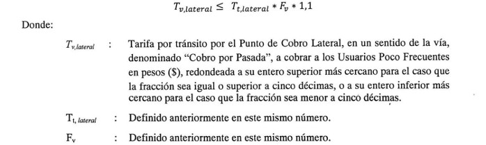 Para los Usuarios Poco Frecuentes, el Concesionario deberá implementar un sistema de cobro alternativo fijo denominado "Cobro por Pasada". Este sistema dará derecho, a aquellos Usuarios Poco Frecuentes, a transitar por el Punto de Cobro Lateral en un sentido de la vía, por una única vez, durante un día calendario conforme a lo establecido en el artículo 2.2.3.3.2 de las Bases de Licitación. Este cobro quedará definido de la siguiente manera: