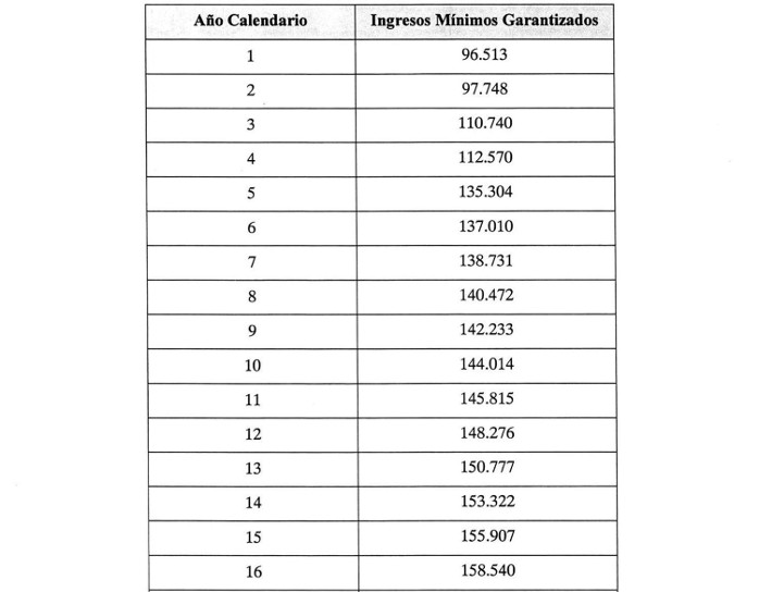 iv) Percibir un Ingreso Mínimo Garantizado ofrecido por el Estado, cuando procediere, de acuerdo a lo expresado en los artículos 1.12.7 y 1.12.7.1 de las Bases de Licitación, cuyo monto para cada año de explotación de la concesión se indica en la Tabla siguiente: