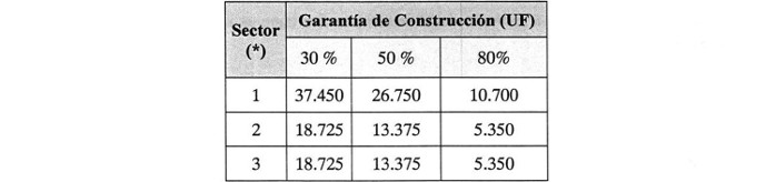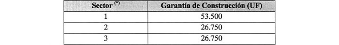 De conformidad a lo establecido en 1.8.1.1, dentro del plazo de 90 (noventa) días contados desde el inicio del plazo de la Concesión y de la Etapa de Construcción, señalado en 1.7.5, el Adjudicatario o la Sociedad Concesionaria en su caso, deberá entregar una Garantía de Construcción para cada uno de los Sectores del Proyecto definidos en 1.3, todos artículos de las Bases de Licitación. Cada garantía podrá estar constituida por 10 (diez) boletas de garantía bancarias de igual monto, o bien, por una póliza de seguro de garantía para concesiones de obras públicas según lo dispuesto en el artículo 1.8.1.3 de las Bases de Licitación, pagaderas a la vista, emitidas en Santiago de Chile por un Banco o Compañía de Seguros de la plaza, según corresponda, a nombre del Director General de Concesiones de Obras Públicas y cuya glosa y/o materia asegurada deberá ser la siguiente: "Para garantizar el cumplimiento de las obligaciones durante la Etapa de Construcción de la Obra Pública Fiscal denominada 'Concesión Vial Mejoramiento Ruta G-21 '". El valor total de cada Garantía de Construcción por Sector será el que se indica en la Tabla siguiente: