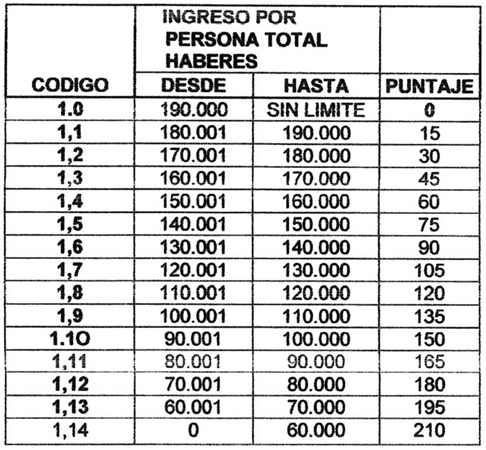 Completar el cuadro con los antecedentes. Incluido el postulante. Obtener el ingreso per cápita sumando el total de ingresos y dividirlo por el total de personas, asignar el puntaje según el cuadro siguiente: